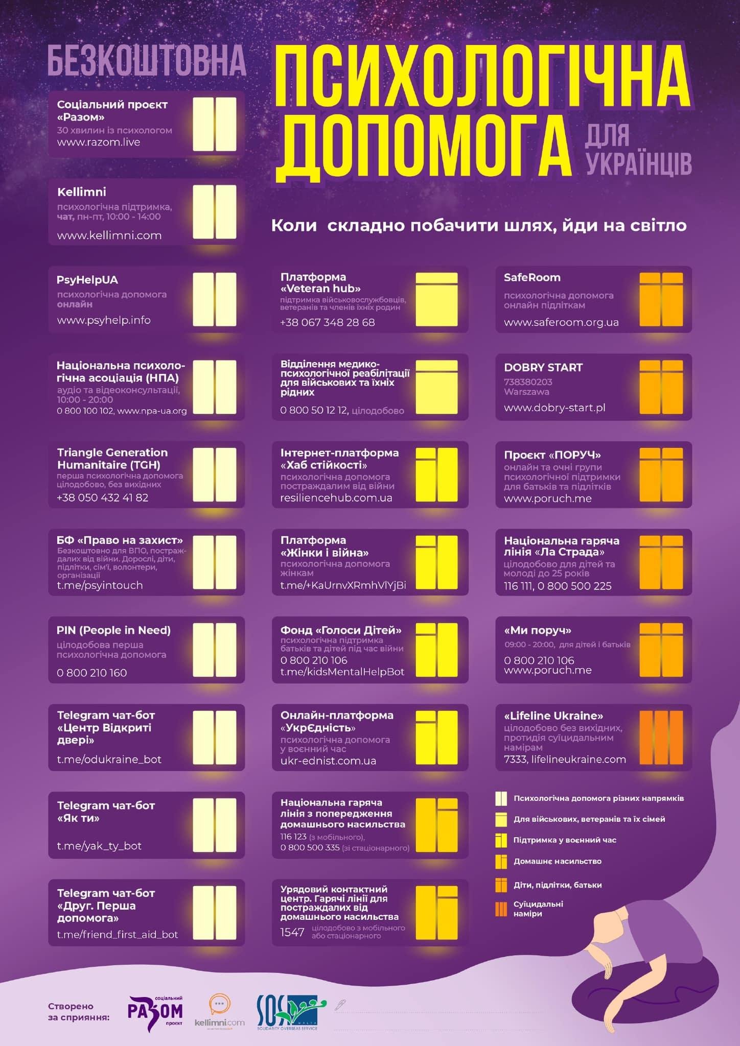 Сьогодні Україна пропонує кілька каналів отримання безоплатної психологічної підтримки. Один з них – це освітні заклади, такі як КПІ імені Ігоря Сікорського, які надають професійну допомогу своїм студентам.