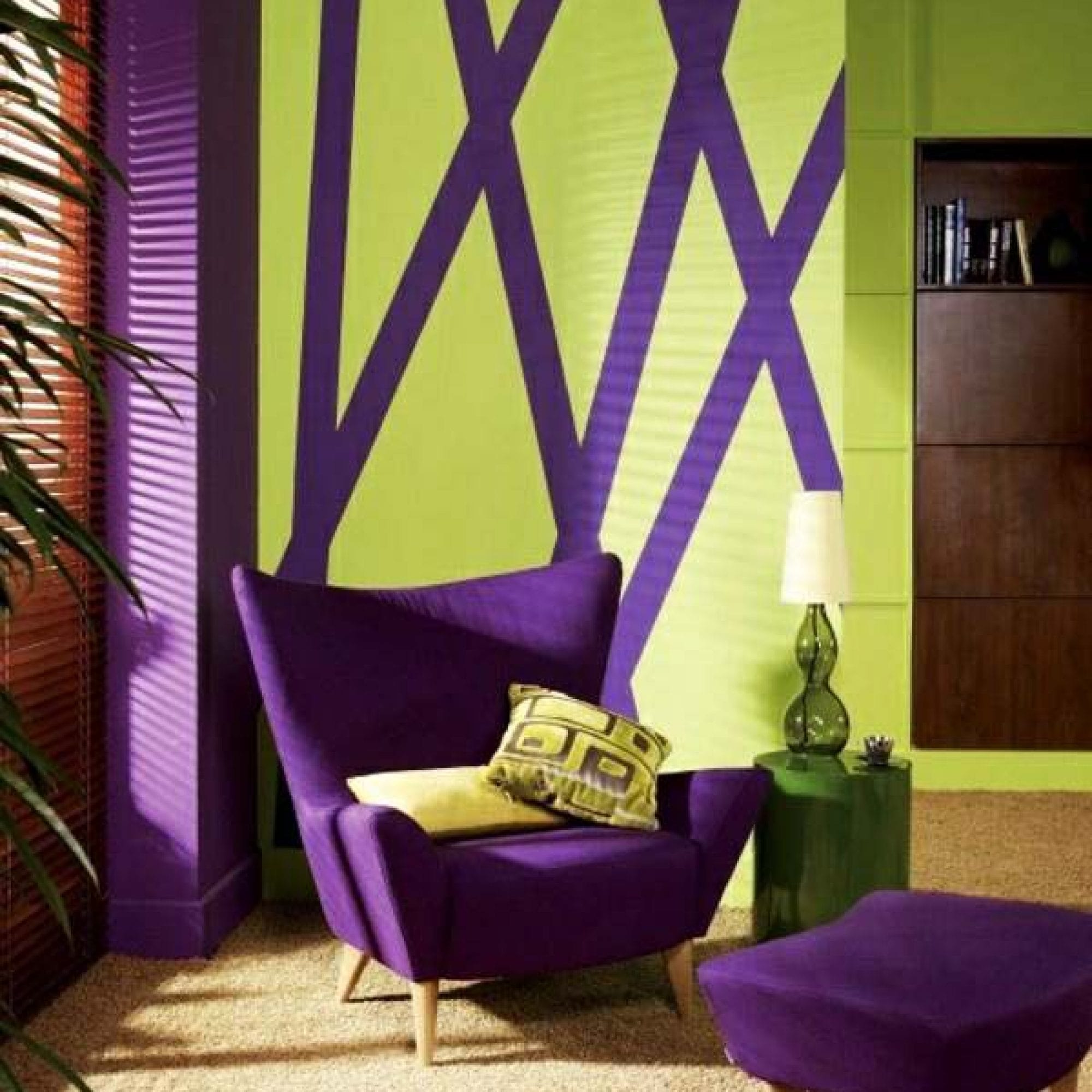 Використання фіолетового та зеленого в інтер’єрі може додати кімнаті сучасності й стилю, водночас залучаючи природні елементи. Це може бути вітальня, кухня або навіть ванна кімната.