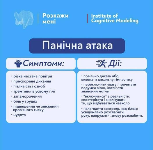 Панічна атака — це раптовий напад інтенсивного страху або дискомфорту, що досягає свого піку протягом кількох хвилин. З’являються такі фізичні симптоми, як часте серцебиття, пітливість, тремтіння або відчуття задухи. Часто виникає відчуття, ніби тебе зараз замкнуть у кімнаті без ключа, навіть якщо ця кімната — це твій мозок.