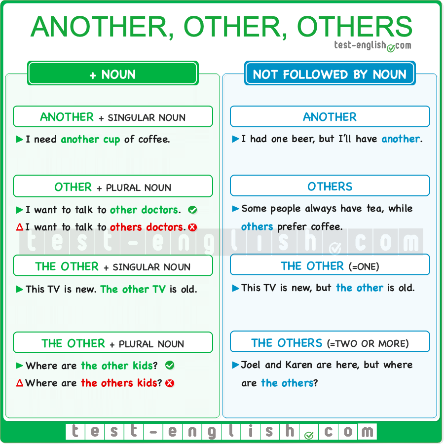 Слово other зазвичай використовується як прикметник або займенник. Іноді вживається з іменниками у множині, а часом просто як займенник, без прив’язки до конкретного об’єкта. Наприклад, якщо у вас є дві книжки, і ви хочете розповісти про одну з них, ви можете сказати: “Я читав цю книжку, але інша ще чекає.”