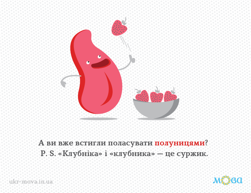 Ну що ж, час розкрити карти. Відомо, що багато хто називає полуницю “клубника”. Це, можна сказати, друге за популярністю її ім’я в усно-розмовній українській мові. Та попереджаю, на заході нашої країни люблять інше словечко.