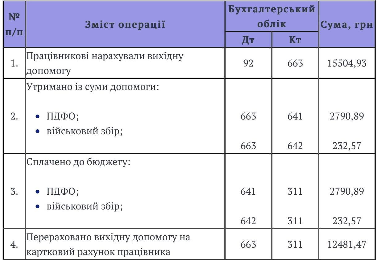 | Причина звільнення | Надання вихідної допомоги |