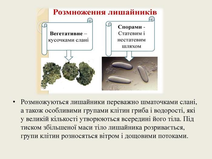 Лишайники — це не окремі організми, а симбіотичні утворення, які включають як водорості, так і гриби. В такій кооперації водорості забезпечують фотосинтез та, відповідно, продукують енергію, яку використовує лишайник для свого росту і розмноження.