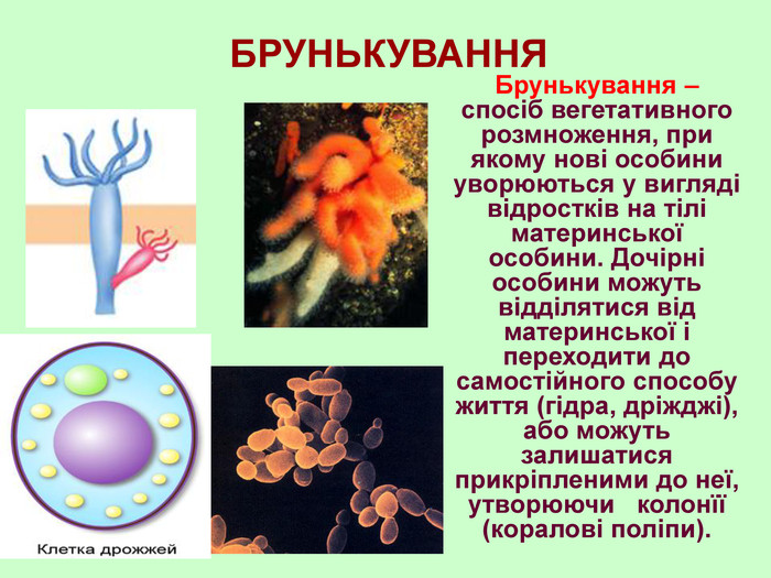 Наша планета наповнена організмами, що вдаються до розмноження брунькуванням, від гідр і коралів до бактерій. Процес брунькування дозволяє різним видам зберігати свої популяції навіть в екстремальних умовах. Але до деталей цього захоплюючого явища ще повернемося.