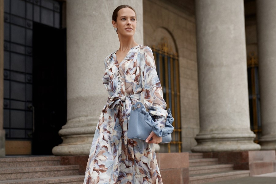 | Сукня у дрібну квітку | Ніжні сандалі і однотонна сумочка |