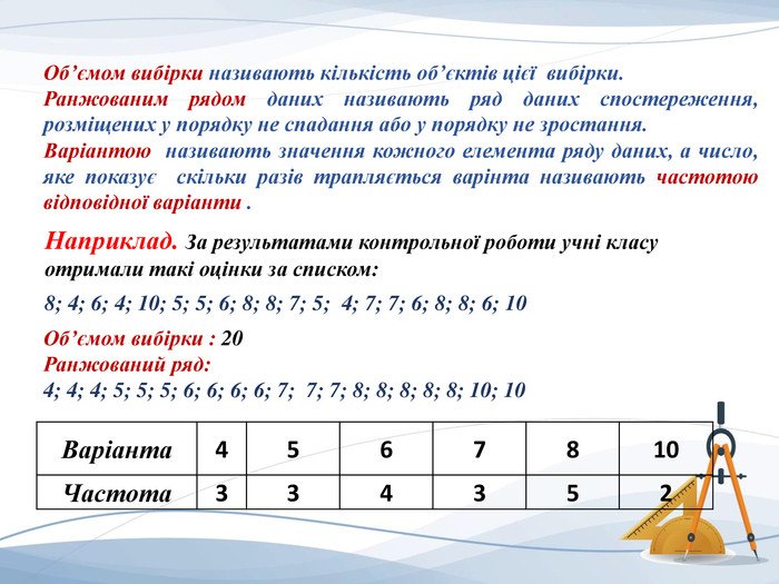 - Дисперсія – відображає середню квадратичну різницю між спостереженнями й середнім вибірки.