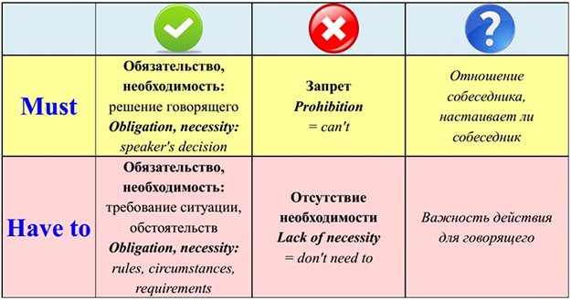 Обом притаманна обов’язковість, але з різним відтінком. Коли говорять «must», це завжди має легкий натяк на рішення особисте, емоційне натхнення. Щось в дусі: «Я таблиць не люблю, але мушу, бо так воно йде.» Щодо have to, то він ніби підштовхує, бо наказують: «Вибач, така політика компанії!»