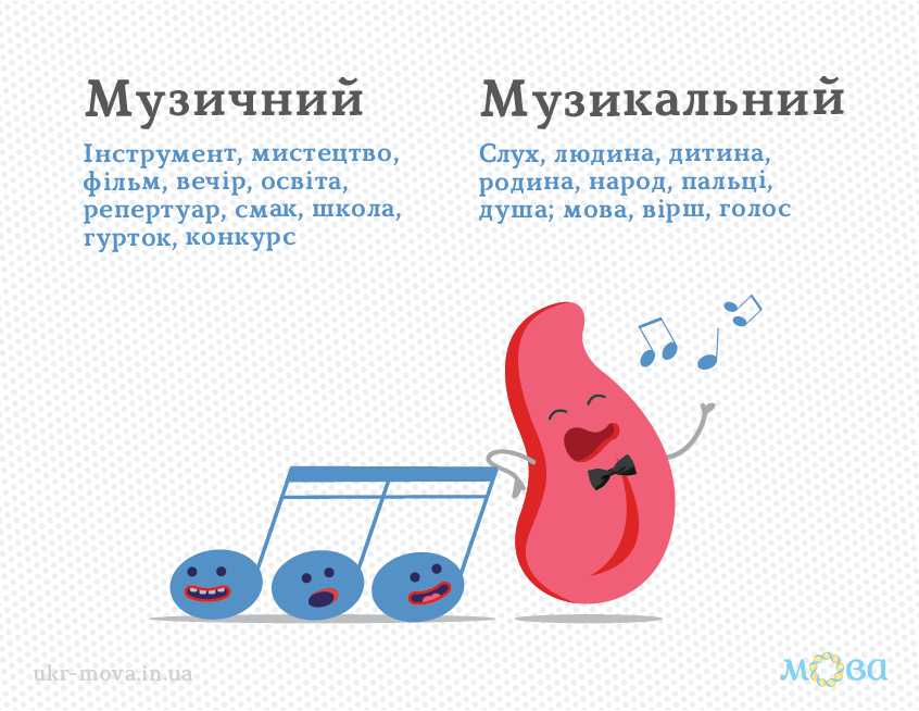 | Наприклад, музичний інструмент, музичний твір | Наприклад, музикальна людина, музикальний голос |