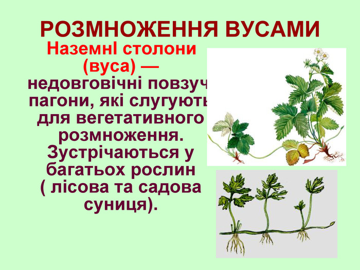 - Процес розмноження за допомогою вусиків називається вегетативним розмноженням.