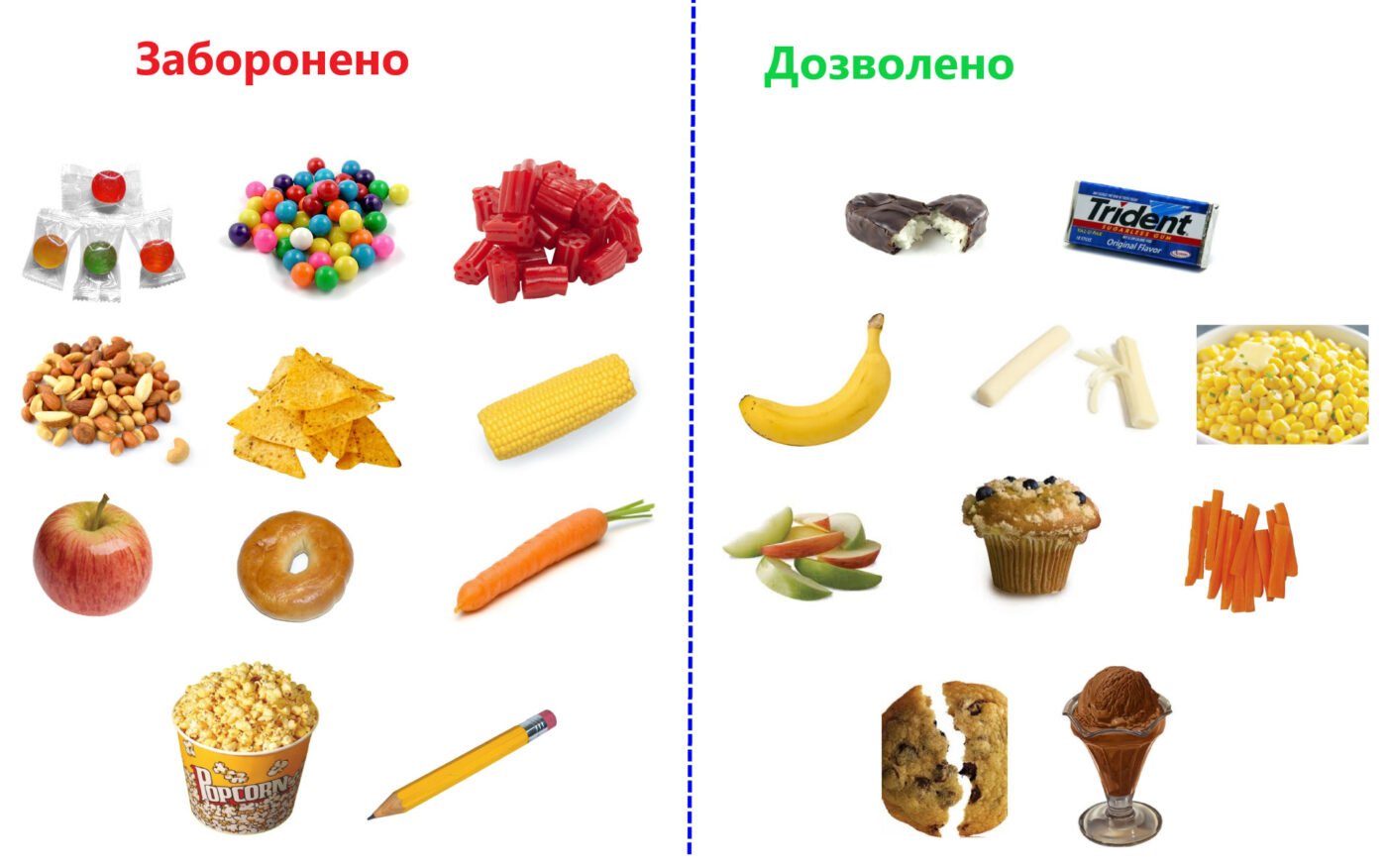 - Карамель, жувальна гумка, інші липкі солодощі — забудьте.