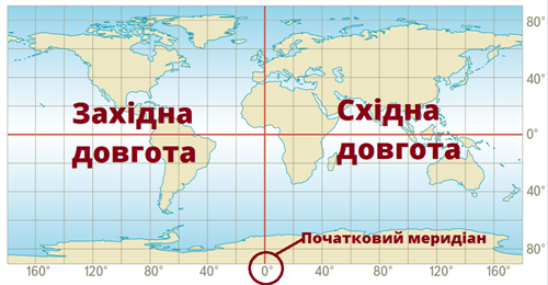 А довгота? Відлік іде від початкового меридіана, розташованого в Гринвічі, Англія. Ось де вже більше простору: від 0 до 180 градусів, на захід або на схід. Стає трохи заплутано, так?
