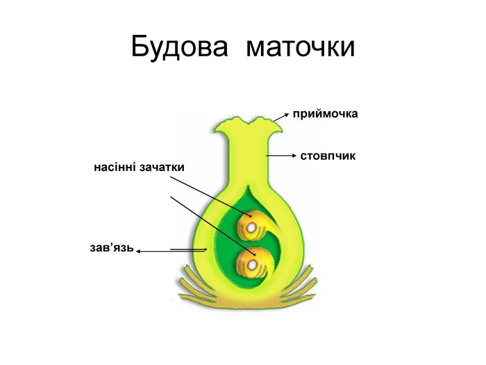 - Маточка: центральний елемент, котрий приймає пилок і формує насіння.