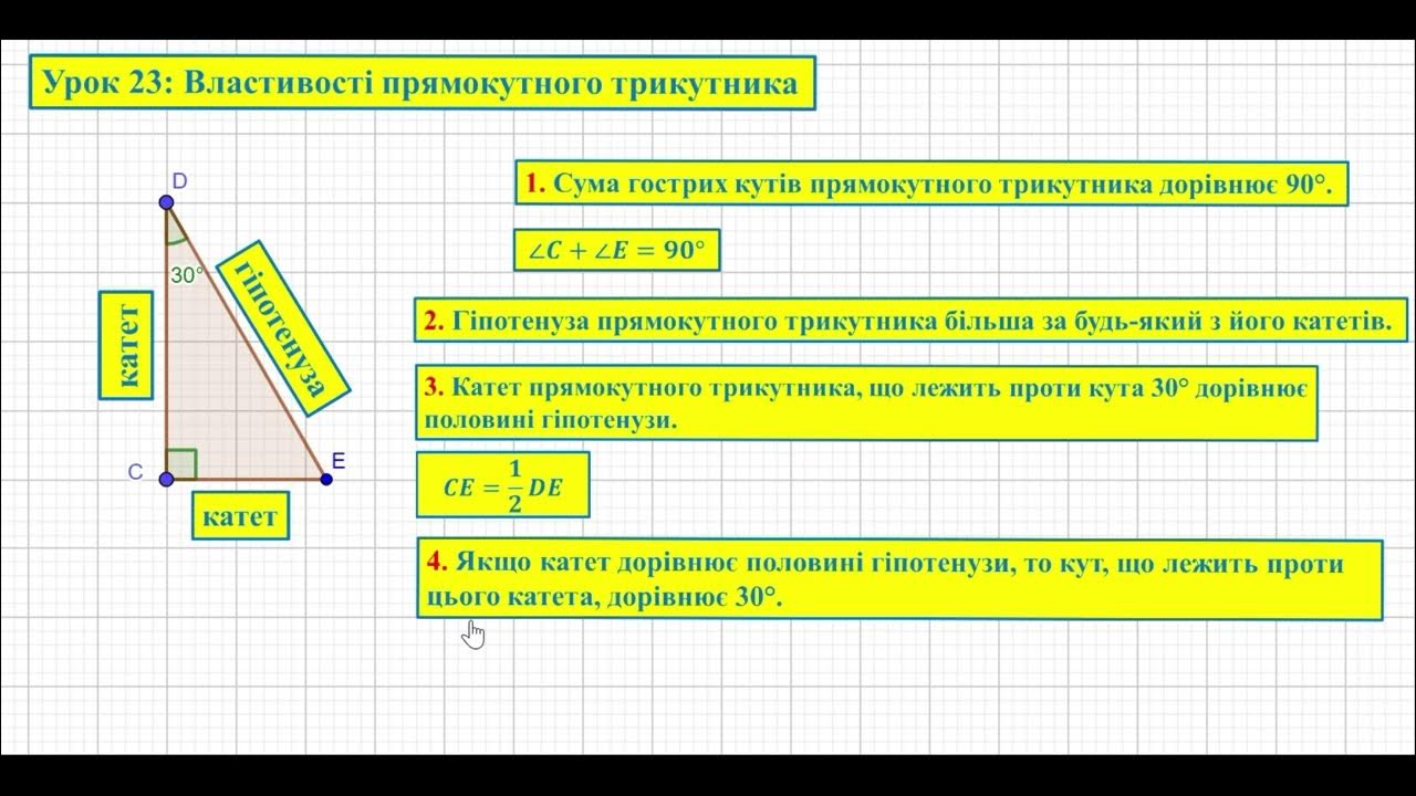 Давайте розберемося: прямокутний трикутник — це трикутник з одним прямим кутом. І тут все стає цікавим: два інших кути обов’язково будуть гострими, додаючи разом аж 90 градусів. І тут ми зустрічаємо гіпотенузу — найдовшу сторону, яка лежить навпроти прямого кута.