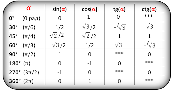 | Кут (градуси) | Синус | Косинус | Тангенс | Котангенс |