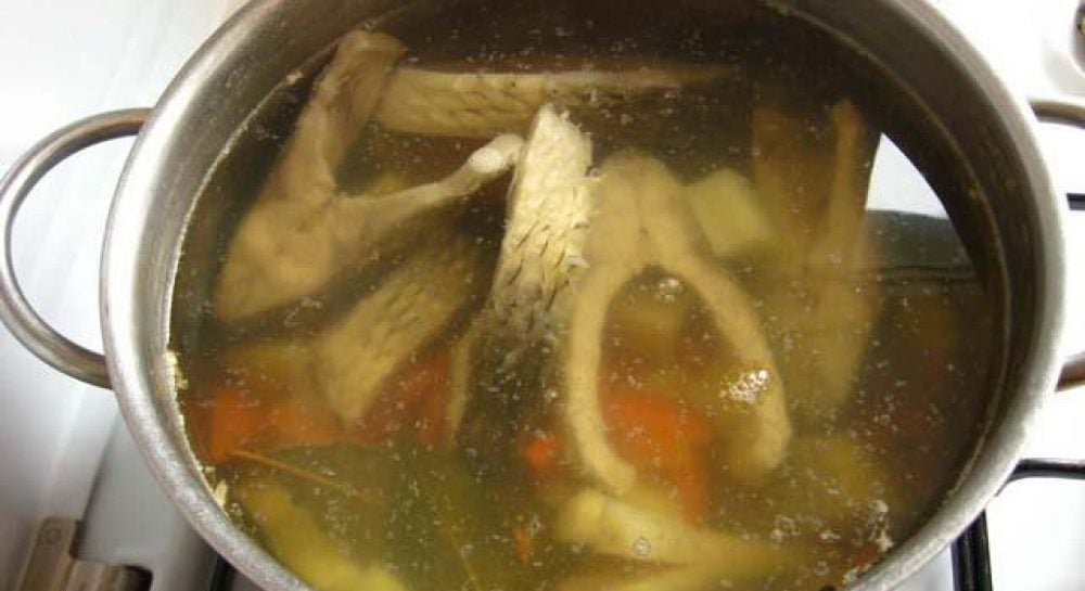 - Беремо велику каструлю, наливаємо води, доводимо до кипіння — і кидаємо в неї риб’ячі казна-які деталі.