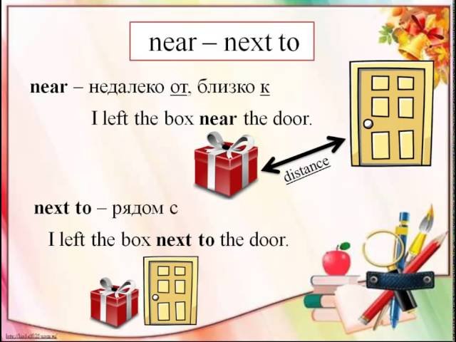 Що означає near? Це слово часто використовують, коли річ знаходиться поблизу, недалеко, але без точної вказівки відстані. На відміну від next to, яке вказує на щось, що безпосередньо чи близько прилягає до іншого предмета. Наприклад, коли стіл стоїть поруч із стільцем, вони next to один одного. Але якщо вони просто знаходяться в одній кімнаті, то вони лише near.