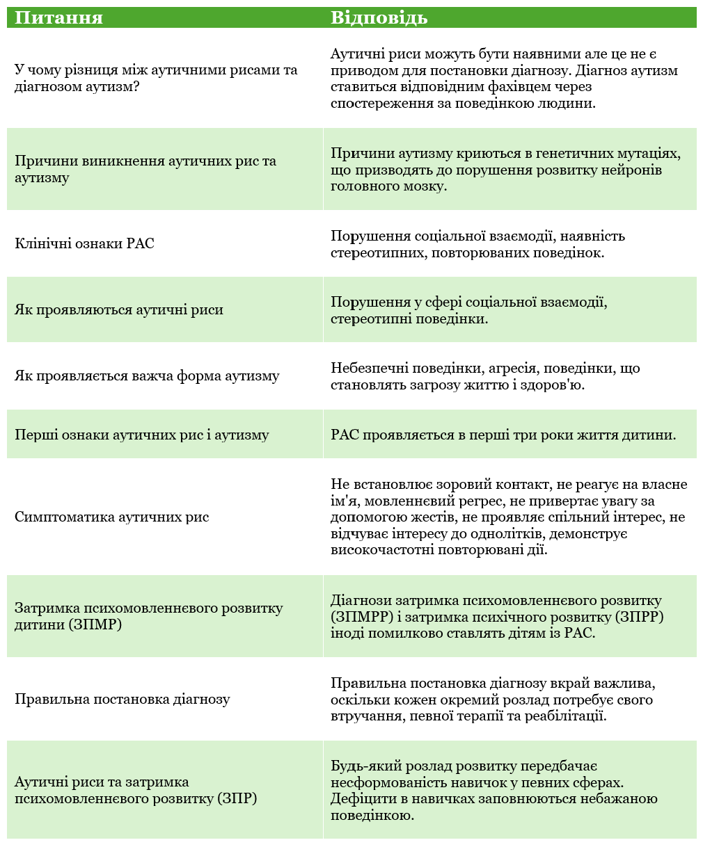 | Області прояву | Повторювані поведінки, інтереси | Труднощі в комунікації |