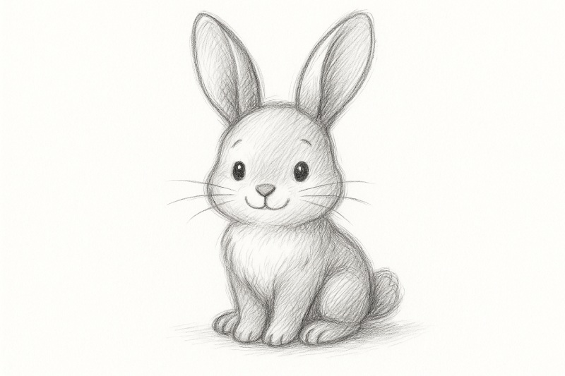 Спочатку зосередьтеся на колі для голови, легкі контури вирізняться під графітом олівця. Тепер прикріпіть довгі, злегка вигнуті вушка. Наступним кроком намітьте тулуб у формі овалу, як плавний потік з голови, і прикріпіть спрощені фігури лапок. Маленький пухнастий хвостик завершить ваш початок. Так просто — чи не так?