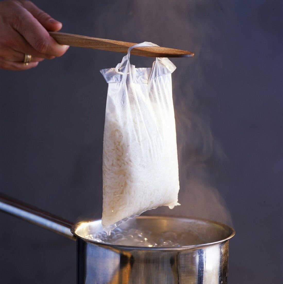 - Дайте рису стекти воді та обережно відчиніть пакетик.
