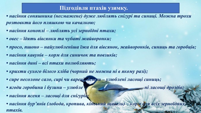 - Синиці — хоч і більше полюбляють сі́ло, пшоно теж часто вибирають.