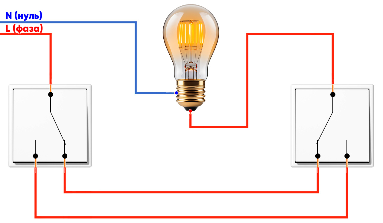 І ось ми підійшли до самого смачного. Як все це підключається? Схема підключення прохідного вимикача може здаватися заплутаною, але в реальності достатньо один раз розібратися, аби зрозуміти. Вона нагадує собою давній ребус, але якщо ви його розв’язали, то всі подальші електромонтажі стануть простішими.