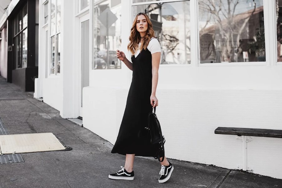 - Футболка під сукню-комбінацію. Цей варіант ідеальний для подорожей або повсякденного літнього вигляду. Просто піддягни білу або чорну футболку під сукню. Легко, просто, а головне — зручно.