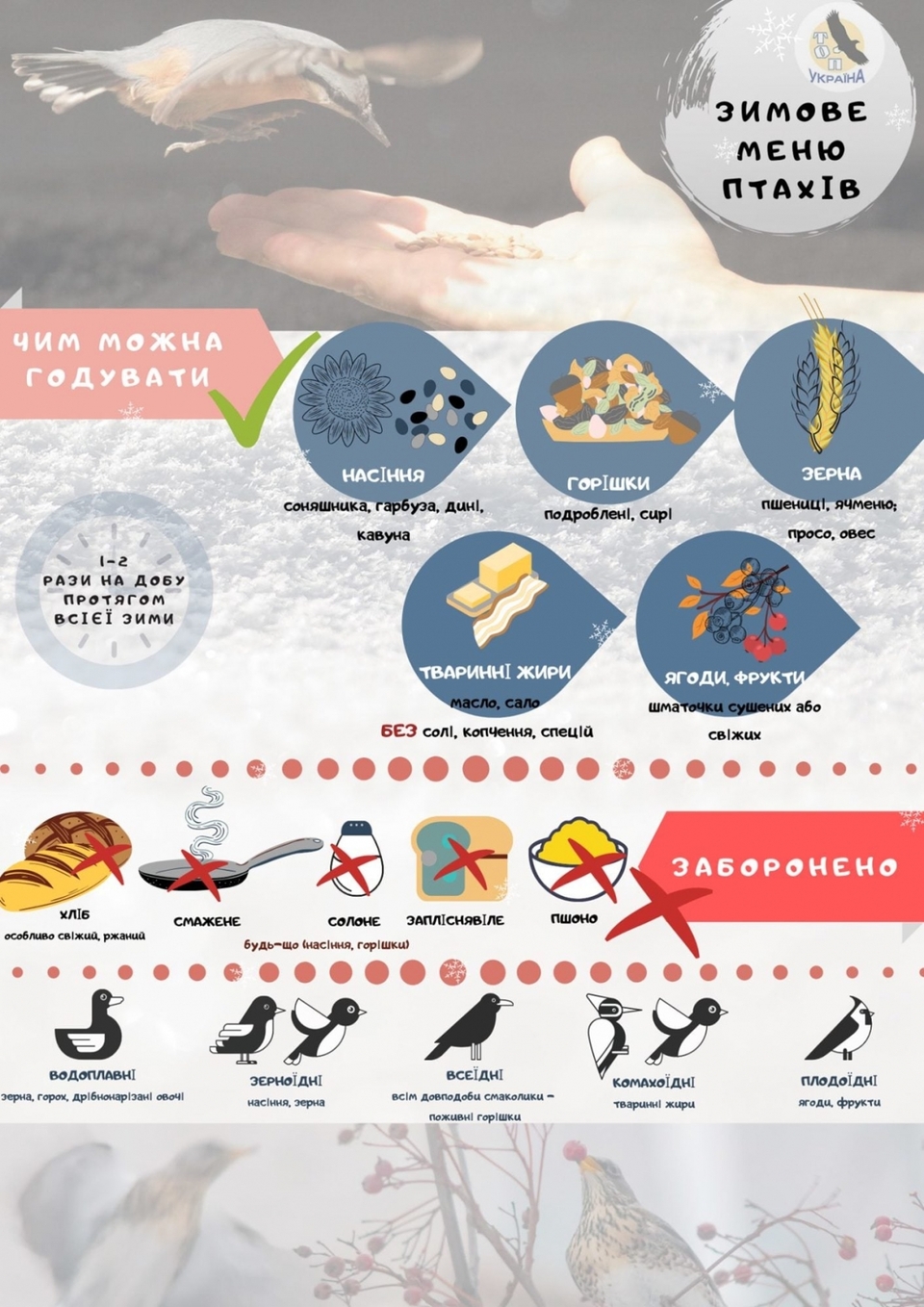 Перше і найголовніше — це здоров’я птахів. Кожен вид має свої особливості травлення, тому що людський їжі вони не завжди радіють. Ми, може, й не усвідомлюємо, але деякі продукти чомусь стають отрутою для цих маленьких створінь. Які ж саме? Дивішся — знаєш.