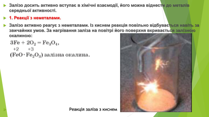 - Спочатку залізо втрачає свої електрони, утворюючи феруму оксид, Fe2O3.