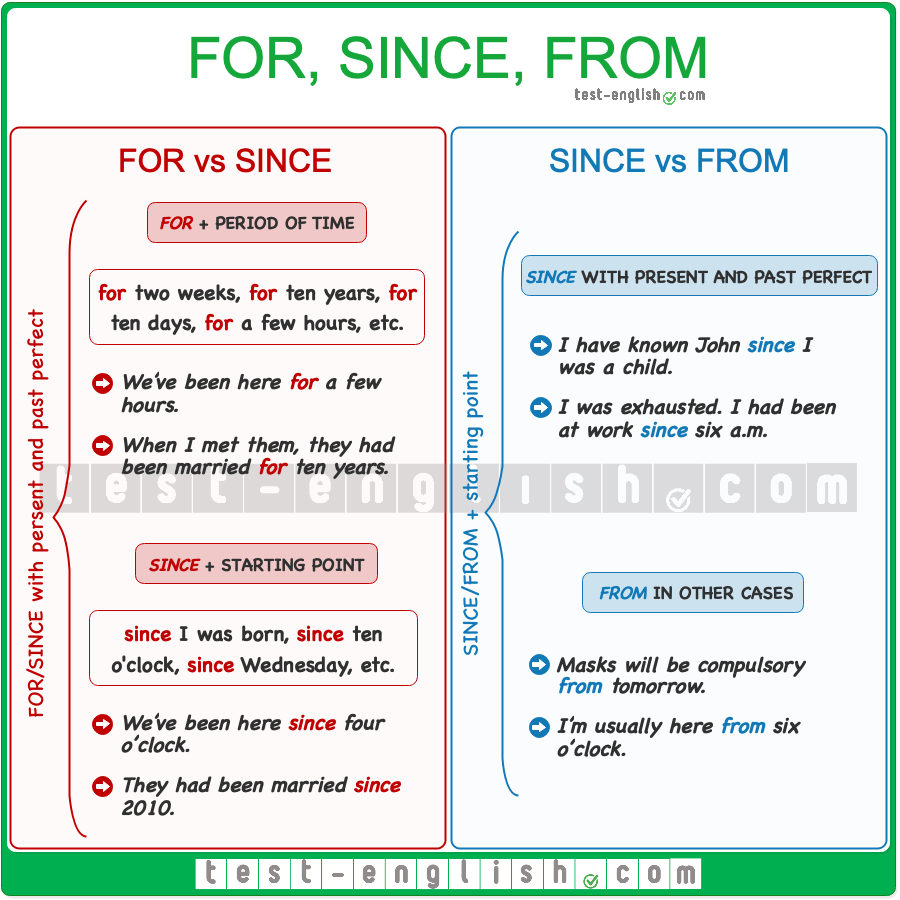 Зрештою, якщо ви розумієте сутність «for» і «since», то у вас не виникатимуть труднощі з їх розмежуванням. Пам’ятайте, for since різниця просто про почуття часу: проміжок або початок.